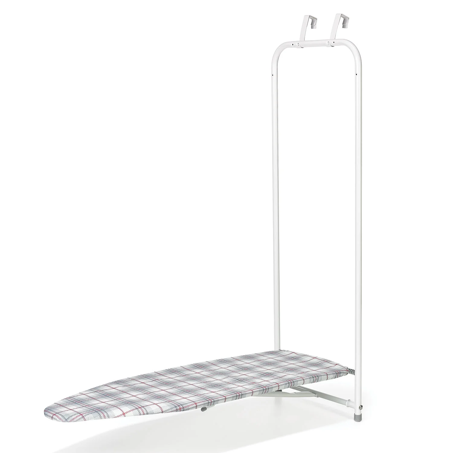 The ideal solution for storing and using an ironing board when space is limited. The steel frame construction hangs over most doors and slimly folds closed so it's hidden and out of the way. Simply pull down the top to open the ironing surface until it snaps in place. A simple release lever allows the unit to fold easily for storage. The perfect solution for apartments, dorm rooms and second homes.